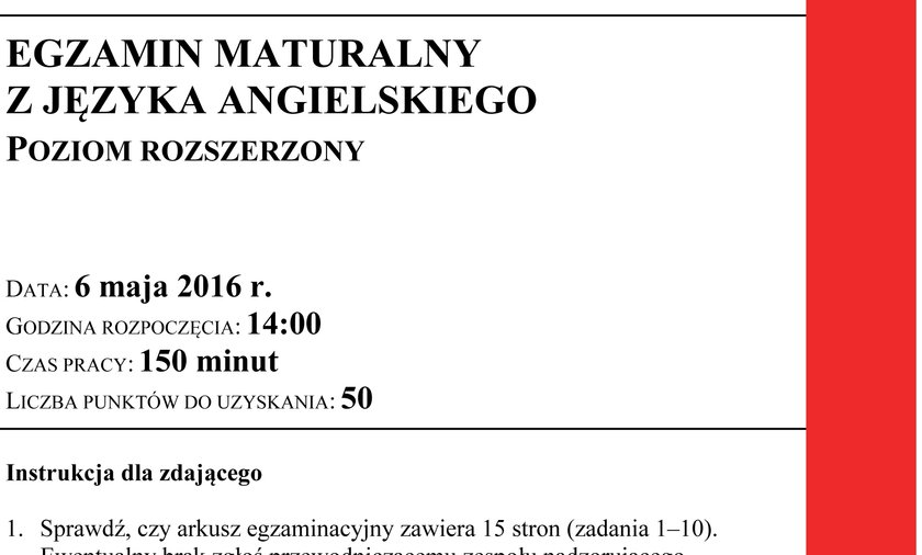 Matura próbna z języka angielskiego na poziomie rozszerzonym — arkusze i klucz odpowiedzi od cke z 8 marca 2021 roku. W poniedziałek, 8 marca, egzamin maturalny z języka angielskiego na poziomie rozszerzonym. 9:00 tegoroczni maturzyści mierzą się z egzaminem dojrzałości z języka angielskiego na poziomie rozszerzonym.arkusz egzaminacyjny z angielskiego pojawi się na stronie cke tuż po godz. W piątek, 7 maja od godz. Arkusze, odpowiedzi, przecieki matura rozszerzona z języka angielskiego rozpocznie się w piątkowy poranek, z kolei około godziny 14:00 centralna komisja egzaminacyjna opublikuje arkusz. Do egzaminu z języka angielskiego na poziomie rozszerzonym. 150 minut liczba punktów do uzyskania: To najpopularniejszy przedmiot do wyboru w tym W piątek, 7 maja o godzinie 9:00 tegoroczni maturzyści zmierzyli się z egzaminem dojrzałości z języka. 7 maja maturzyści przystąpili m.in. Język angielski na poziomie rozszerzonym zadaje dziś 158,4 tys. Zobacz arkusze cke i odpowiedzi: Język angielski (poziom dwujęzyczny) godz.